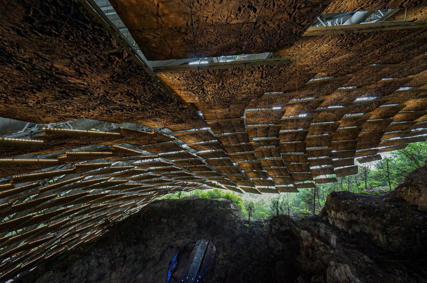 Using the existing mountain contour lines as clues to deduce the shape of the mountain before the collapse of the Peking Man Cave,the overall form of the protective structure is determined,and the growing green plants help integrate the new architectural form with the surrounding mountain environment.